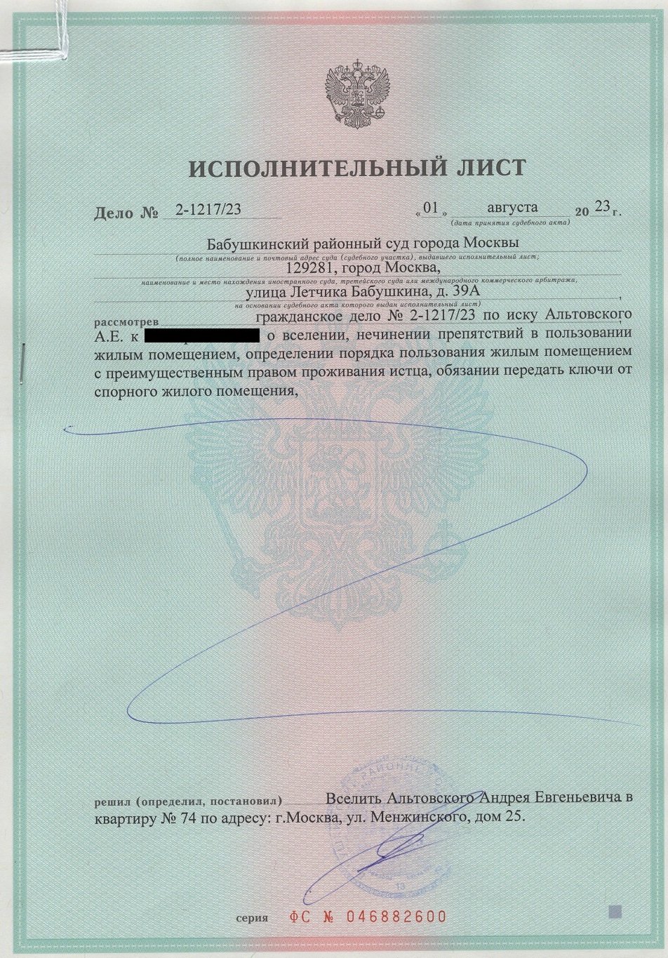 СОСОБСТВЕННИК ПОЛУЧИЛ ИЗ СУДА ИСПОЛНИТЕЛЬНЫЙ ЛИСТ и ОЖИДАЕТ ВСЕЛЕНИЯ СУДЕБНЫМИ ПРИСТАВАМИ В ПОРЯДКЕ УСТАНОВЛЕННОМ ЗАКОНОМ - НА ОСНОВАНИИ ИСПОЛНИТЕЛЬНОГО ЛИСТА, С СОСТАВЛЕНИЕМ ПРИСТАВОМ АКТА О ПРИНУДИТЕЛЬНОМ ВСЕЛЕНИИ, С ПРЕДВАРИТЕЛЬНЫМ ПРИНУДИТЕЛЬНЫМ ИЗЬЯТИЕМ КЛЮЧЕЙ У ОТВЕТЧИКА (С СОСТАВЛЕНИЕМ АКТА-ПРИЁМА-ПЕРЕДАЧИ КЛЮЧЕЙ).