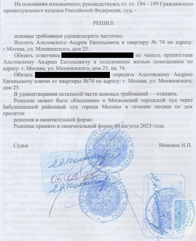 РЕШЕНИЕ СУДА О ВСЕЛЕНИИ ПРОПИСАННОГО СОСОБСТВЕННИКА ВСТУПИЛО В СИЛУ: