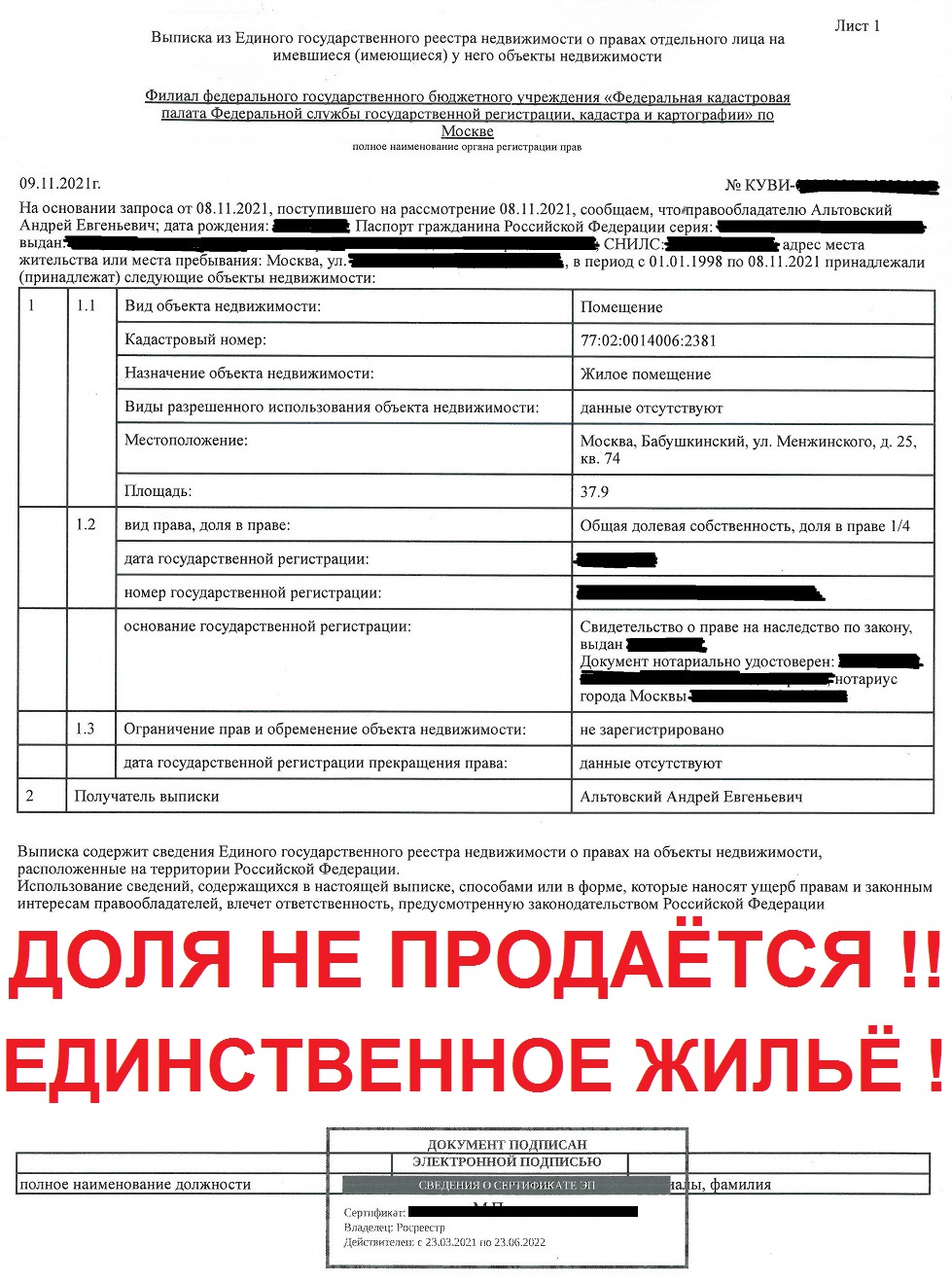 Т.О. РАЗУМНЕЕ (И ДЕШЕВЛЕ) КУПИТЬ "ЧИСТУЮ" ДОЛЮ В КВАРТИРЕ, НЕ ИМЕЮЩЕЙ ЗАРЕГИСТРИРОВАННЫХ И ВСЕЛЕННЫХ СУДОМ (НЕТ ПРОБЛЕМ СО ВСЕЛЕНИЕМ/ПРОЖИВАНИЕМ И ИЗБАВЛЯТЬСЯ ОТ ТАКОЙ НЕТРУДНО) - СМОТРИ ВСЕ ПРОДАЮЩИЕСЯ НА ЦИАН "ЧИСТЫЕ" ДОЛИ В МОСКВЕ - ВОТ ЗДЕСЬ => https://www.cian.ru/kupit-dolu-v-kvartire